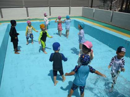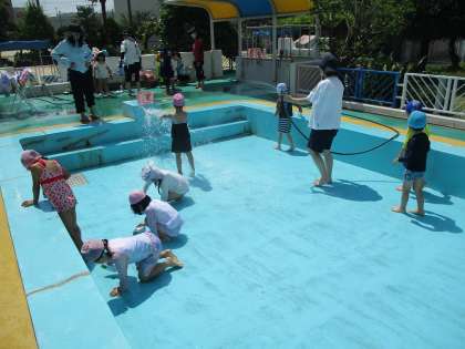 プール清掃(にじ組)、水着に着替えたよ(もも組)