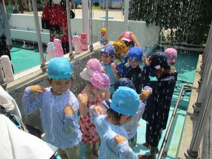 あまりにも暑かったのでシャワーの入り方やプールの入り方の話をよく聞いて、プールに入ってみました。みんな大喜びです。