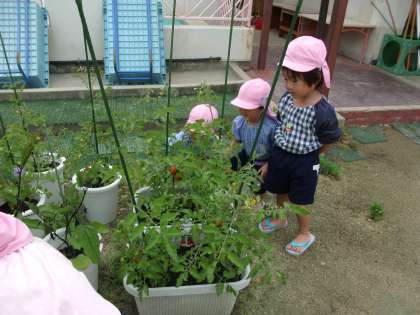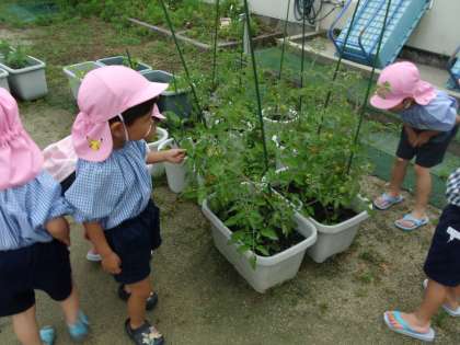 雨上がりの園庭に出て!(もも組) 公開日 2025/06/24 更新日 2025/06/24 保育の様子 今日は朝から雨だったのでプール開きができませんでした。子どもたちはとても残念がっていましたが、明日はできるかもしれないと期待に胸を膨らませています。 昼から園庭に出ると幼稚園で育てている野菜ができているのに気付き「先生、トマトできてる〜」「えだまめもなってる〜」と子どもたちが発見して知らせています。 いいね(0)