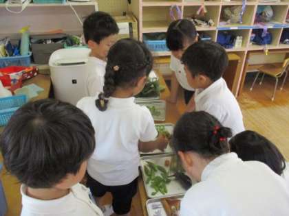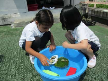 水遊びが始まり、子どもたちはいろいろなことに面白さを見つけて遊んでいます。葉っぱやカップやペットボトルが水に浮くことに気付き「空気が入ってるから浮かぶんかな?」「重いのは沈むと思う」「形が船みたいだから浮くんちゃう?」など子どもたちからたくさんの考えが飛び出しました。にじ組で実験をしました!園庭に探検に出かけ、水に浮くか試したいものを集めてきました。保育室にある素材も準備して、水の入ったケースに入れてみました。トマト・オクラ・ナス・ブドウ・枝・折り紙・ケント紙などなど・・さあ何が沈んだでしょう?たくさんの大発見になりました。