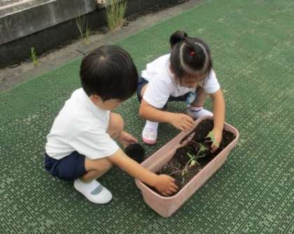 ヒマワリの花、咲くの楽しみ! 公開日 2025/07/02 更新日 2025/07/02 保育の様子 種から芽が出たヒマワリが大きく生長しました。葉っぱも8枚に増えたので、子どもたちと大きなプランターに植え替えました。お花の勉強会で苗の植え替えの仕方を教えてもらったので子どもたちは手際よくヒマワリの苗を植え替えていました。ヒマワリの花はいつ咲くかな?楽しみにしています。 いいね(0)