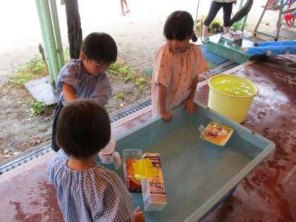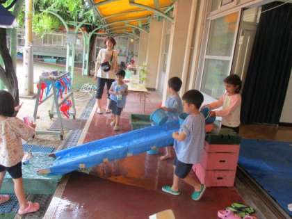 今日は急に大雨が降ってきました。午後から全園児で水を使って遊びました。5歳児が水に浮かぶものを素材でつくって遊んでいるので、4歳児も真似をしてつくっていました。紙でつくったものや、素材に水が入ってしまうと沈んでしまいます。何度も作り直したり試したりして遊ぶ様子が見られました。滑り台ではつくったものを置いただけでは滑りません。遊びながら水を流すことで、流れることに気付く姿もありました。遊びながら子どもたちはいろいろなことに気付いて、試しています。これからもいろいろなことに好奇心をもって遊べるように保育を進めていきたいと思います。
