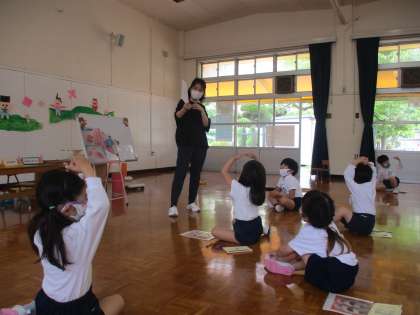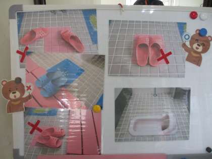 みんながきれいにトイレを使うためにはどうしたら良いか確認しました。トイレ内を汚さずに使うことやスリッパをきれいに揃えることなどを伝えています。