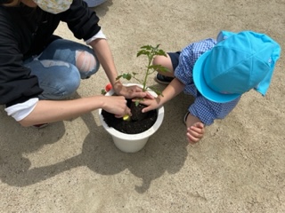 ミニトマト・ピーマン・ナス・オクラの苗の中から、ひとつ好きなものを選んで、保護者の方と一緒に夏野菜を植えました。