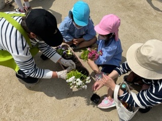 夏野菜植えの後は、西淀川区のボランティアの方々による『お花のべんきょうかい』で、色とりどりの花の植え方を教えていただきました。