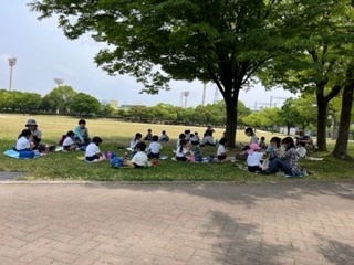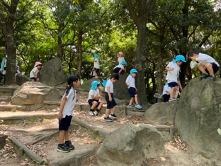 木陰でシロツメクサを摘んだり、自然物を見つけたり、飛んできたチョウチョを追いかけたりして、子どもたちは元気いっぱいでした。