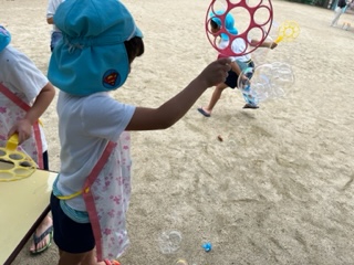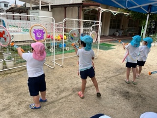 園庭では『水鉄砲』と『シャボン玉』をしました。