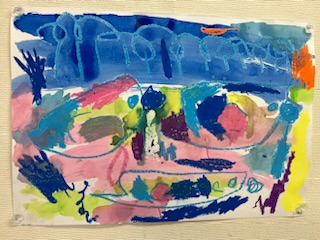 園庭にあげているこいのぼりの絵をかきました。お空で気持ちよく泳いでいるねと、子どもたちもこいのぼりをしっかり見ながらかきました。その後は、うすい絵の具で色をつけるはじき絵、、