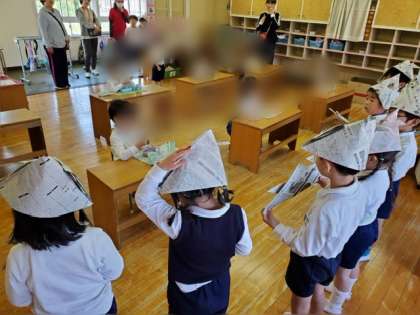にじ組さんが新聞紙を使ってかぶとをつくりました。できたかぶとをかぶって鏡の前に立ってみたり、友達と見せ合ったりして楽しみました。また、もも組さんにもプレゼントをしました。プレゼントをもらったもも組さんも嬉しそうにかぶって遊んでいました。みんなとても似合っていました。