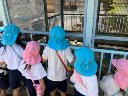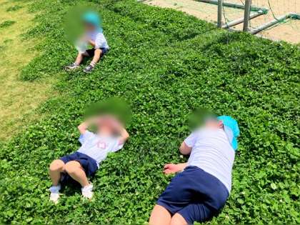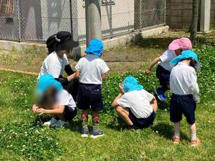 今日は小学校の芝生で遊びました。クローバーやシロツメクサがいっぱい!子どもたちはシロツメクサを摘んだり、寝転がって遊んだりして楽しそうでした。また、帰りに鯉やカメを見ると「鯉のお口がパクパクしてるな」「いろいろな色をしているね」など嬉しそうに見ていました。自然や生き物にいっぱい親しみました。