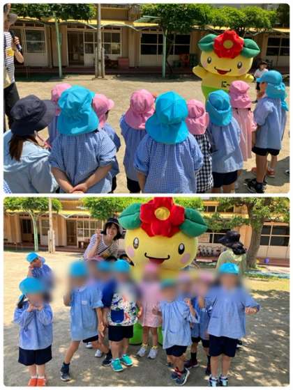 西淀川区役所の方とボランティアの方が幼稚園にお花の植え方を教えに来てくれました。ペチュニアやマリーゴールドの綺麗なお花を植えると子どもたちも「きれいー」「かわいいお花」と喜んでいました。そして、マスコットのにーよんも遊びに来てくれました。子どもたちはにーよん登場に大興奮。。「にーよん♪」とふれあいを楽しんだり、質問したりと楽しい時間を過ごしました。