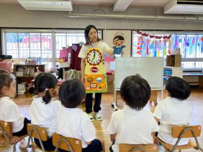 保健指導(7月) 公開日 2023/07/09 更新日 2023/07/09 保育の様子 今月の保健指導は睡眠についてです。5歳児にじ組では、クイズ形式で行い、4歳児もも組はエプロンシアターを使って行いました。どちらも寝ることは元気で過ごす大事なこと、そして、朝ご飯もしっかり食べて強く、元気な体を作りましょう。子どもたちも楽しみながら、体のことを知るよいきっかけとなりました。 いいね(0)