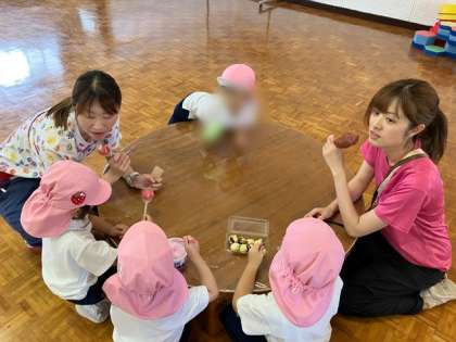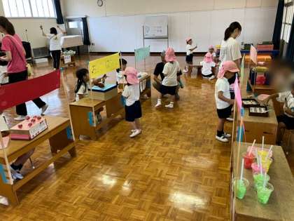 保護者の方が開催してくださった「大和田まつり」に影響をうけ、にじぐみが「にじぐみまつり」を開催しました。りんごあめ・とうもろこし・ジュースなど美味しそうなお店がいっぱいです。また、わなげやボーリングなど楽しそうなゲーム屋さんもありました。お客様になったもも組さんも買いに行ったものを食べたり、ゲームをしたりして楽しんでいました。11日(月〕は保護者の方を招待してお祭りをします。「にじぐみまつり」楽しみです。