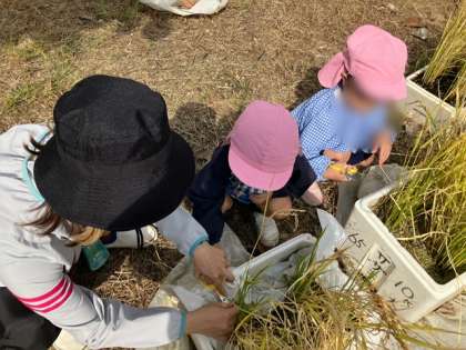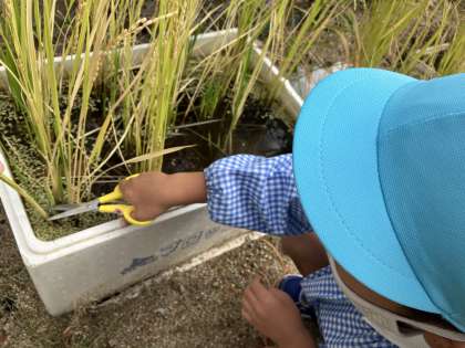5月に小学校で植えたお米の苗がすくすく育ちました。今日は稲かりです。教頭先生からお米のお話を聞き、さっそく、自分のハサミをもって、ちょきん。。と切りました。お米になるまであともう少し。。楽しみですね。