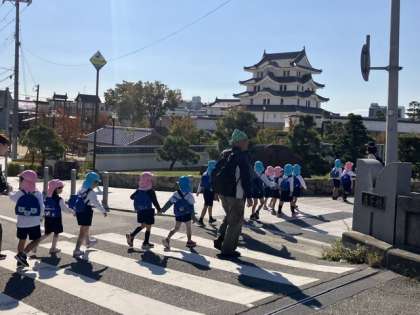 今日は尼崎城址公園に園外保育に出かけました。お城の中では、お姫様や忍者の衣装を来て楽しんだり、大きいパノラマを見て楽しみました。みんなでおにぎり弁当を食べたあとはアスレチックの公園で存分に楽しみました。帰りは阪神電車も見て、充実した一日を過ごしました。