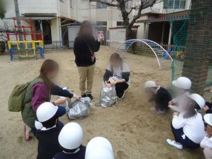 「先生たちのリュックには何が入ってるの?」と、子どもたちから質問があったので、非常持ち出し袋の中身を知らせました。真剣に見聞きし、より関心が高まったようでした。