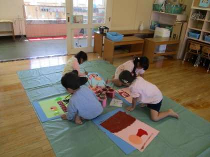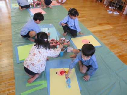 にじ組5歳児が夏休みの楽しかったことを絵の具でかきました。一人一人が楽しかったことを思い出しながら、丁寧に絵をかく姿が見られました。絵の具や筆の使い方も考えながら使っている様子は5歳児ならではの経験の積み重ねだと感じました。みんなの絵からは楽しさがあふれていました。楽しい経験をしたことが、表現する喜びや楽しさにもつながるのだと思いました。楽しい夏休みをありがとうございました。これからもいろいろな表現遊びをしていきたいと思っています。