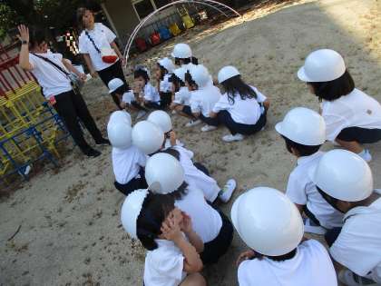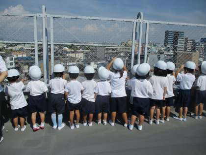 ヘルメットを被り、一旦、安全な場所(園庭)に集まり、その後、小学校の屋上に避難しました。みんな静かに階段を上がって屋上に上っています。