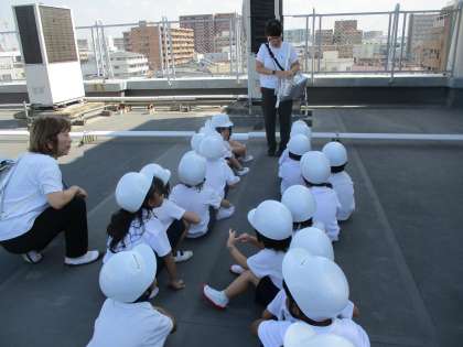 その後、みんなで屋上から幼稚園を見ました。「プール見えた」「僕の家見えるかな?」と言っている姿がありました。