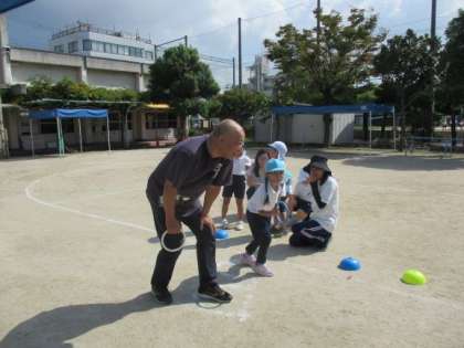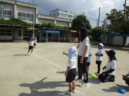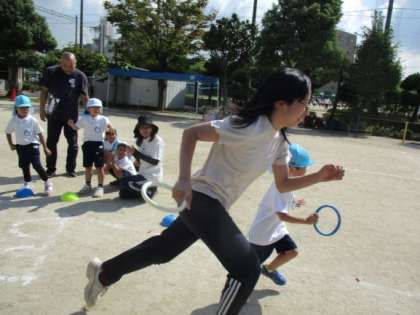 「今日はリレーする?リレーしたい!」と子どもたちから言われるようになりました。毎日いろいろな先生がチームに入ってリレーをしています。子どもたちは思いっきり走る心地よさも感じ、トラックを力いっぱい走っています。走る順番も同じチームの友達と話し合って決めています。自分の力を思い切り発揮することや、友達とバトンをつないで力を合わせて遊ぶ面白さや満足感を感じることで、「もっとやりたい!」と自分たちで遊びを進めたり、作戦を考えたり、主体的に活動するようになっています。子どもの“やりたい”の気持ちを大切にこれからも保育を進めていきます