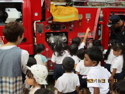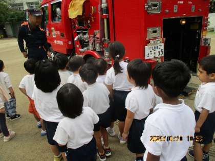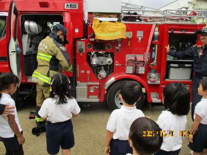 避難訓練で消防車が来たよ! 公開日 2025/10/21 更新日 2025/10/21 保育の様子 火災が起こったことを想定して避難訓練をしました。繰り返し訓練をすることで「先生の指示を聞いて、安全な場所に避難する」行動が身に付いています。 消防車が来ました。 職員は消火器の使い方を聞き、実際にやってみました。 子どもたちは消防士さんから消防車のいろいろな使い方を教えてもらい目をキラキラ輝かせながら話を聞いています。又、実際に消火活動に着る服も見せていただきました。 いいね(0)