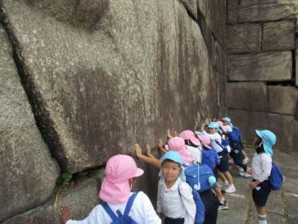 園外保育で大阪城へ行きました。大阪城の周りにはとても大きな石がたくさん積まれています。昔の人たちはどうやって運んだのかな?みんなで押してもビクともしませんでした。