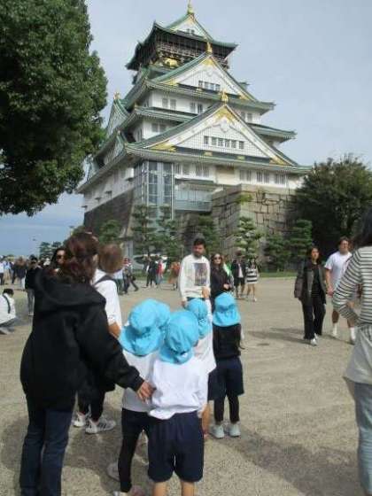 5歳児にじ組は天守閣にのぼりました。上からもも組に手を振り、降りてからも大阪城を見ていると「トラが付いてる!」「ピカピカ!」「大きいな〜3階になってる」と興味津々な子どもたちでした。