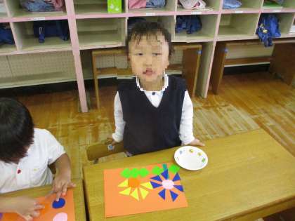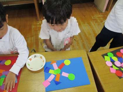 〇、△、□、長い□の折り紙を画用紙に貼りいろいろな形を作りました。「お花つくったよ」「たいように見えるやろ」など思い思いに