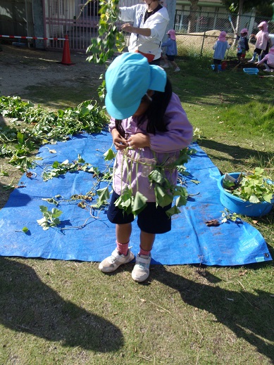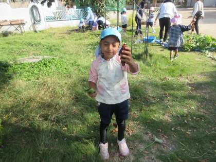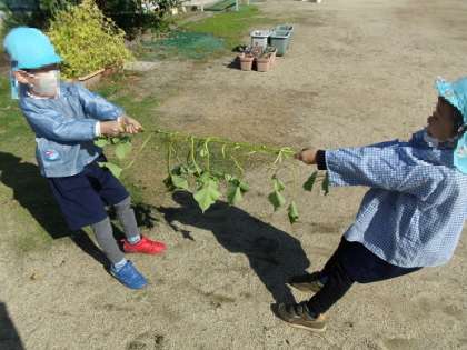 さつまいもが採れたよ 公開日 2025/11/04 更新日 2025/11/04 保育の様子 手に大きなさつまいもを持ち「見て見てー」と笑顔を見せる子どもたち、「こんなにおおきなさつまいもが採れたよ〜」と言っています。 スカートのように腰に巻き付けています。嬉しそうです。 引っ張り合って綱引きです。「ひっぱるぞ〜」と力を入れています。 いろいろな遊びが広がっています。 いいね(0)