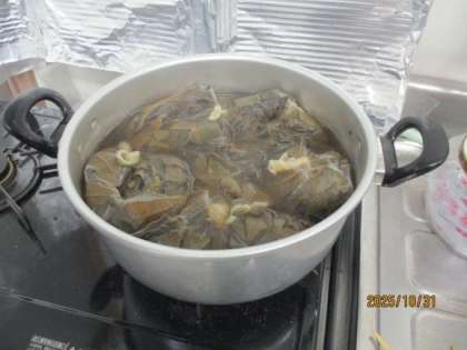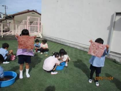 幼稚園のビワの葉を使って、ビワの葉染めをしました。子どもたちと10月の終わりから、ビワの葉でどんなことができるのかを考え、試し、染めることにしました。ビワの葉を切り、煮るときれいな色がでます。そこに少し魔法をかけると・・なんと素敵なことがおこりました!!身近な自然に触れながら、自然の不思議さを感じ、試したり試行錯誤したりすることが学びの芽につながるのではないかと考えます。作品展に飾るのでぜひ見に来てくださいね!