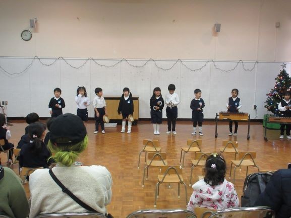 終業式では子どもたちが保護者の前で歌を歌ったり、合奏をしたりしました。