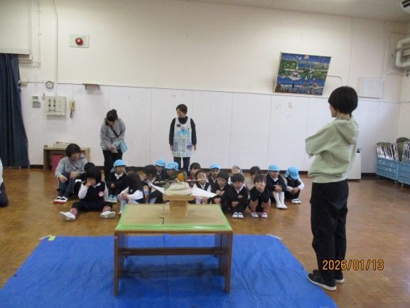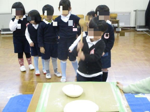 今日は幼稚園で鏡開きをしました。鏡開きとはお正月に飾った鏡もちを木槌などで開く(割る)ことで健康や幸せをいただく行事です。