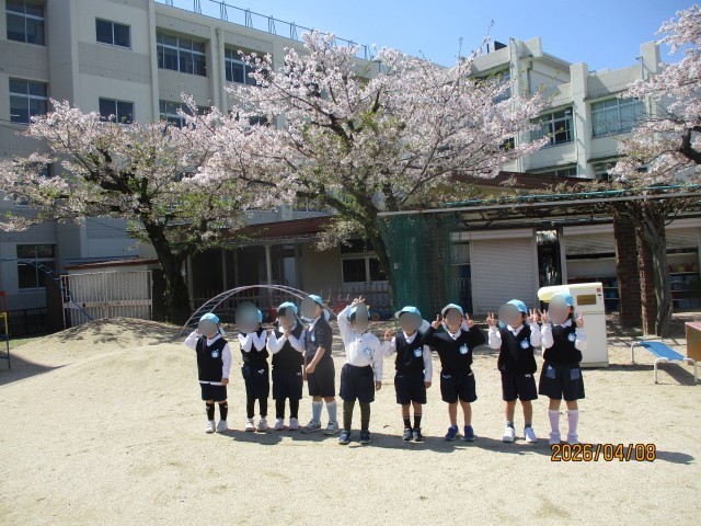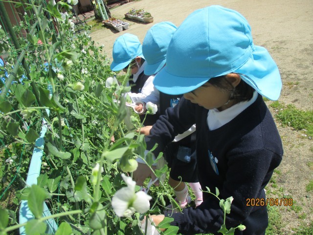スナップエンドウの収穫をしたり、園庭で好きな遊びを楽しんでいました。綺麗に咲いている桜の花の下で記念撮影です。