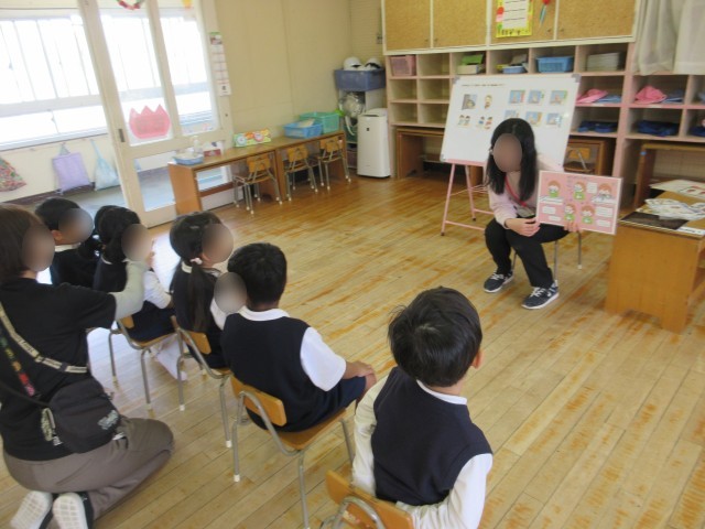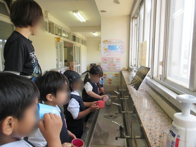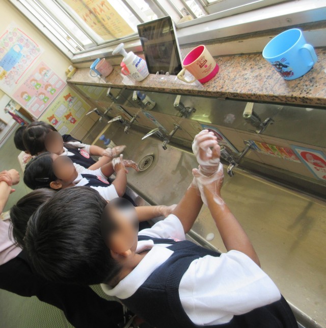 幼稚園で、はじめての保健指導として「てあらい・うがい」についてお話しました。「どんなときにてあらいしてるかな?」と聞いてみると、「帰ったとき!」など、子どもたちからたくさんの声があがりました。そのあとは、みんなでてあらいのやり方を確認しました。せっけんをつけて、手のひらや指の間まで、ていねいに洗うことを知り、一生懸命取り組んでいました。うがいも、「ぶくぶく〜」「がらがら~」と楽しみながらチャレンジしました。保健指導をきっかけに、てあらい・うがいの大切さにふれることができました。これからも毎日の生活の中で、少しずつ身につけていけたらと思います。