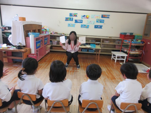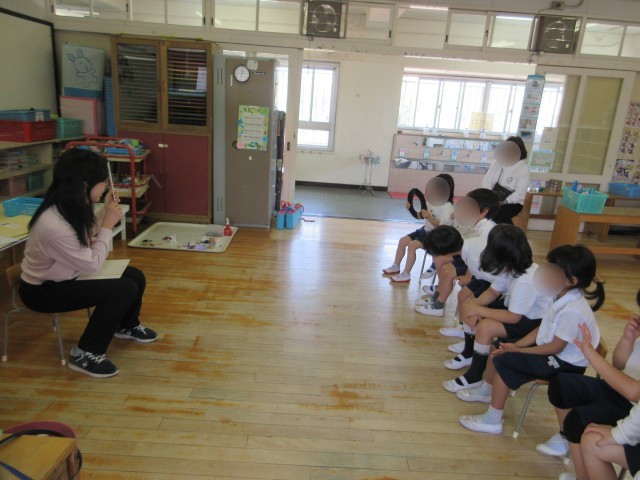 月曜日からの視力検査に向けて子どもたちが安心して視力検査を受けられるよう、事前にお話や練習を行いました。視力検査では、片方の目を隠して、見えた方向を伝えます。「どっちかな?」とクイズのように楽しみながら、やり方を知ることで、当日も落ち着いて取り組めるようにしています。また、「見えにくいときは、がまんしないで教えてね」と伝え、自分の体の様子に気づく大切さも一緒に学びました。