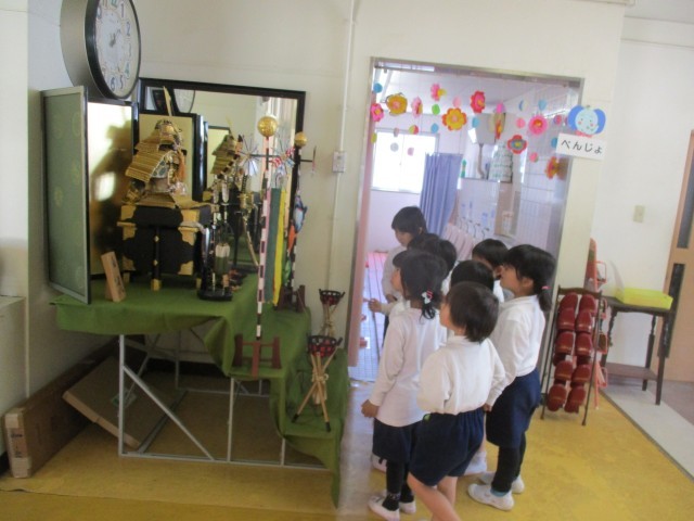 幼稚園にこいのぼりがやってきました。玄関には5月人形の兜も飾っています。