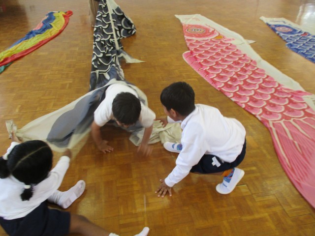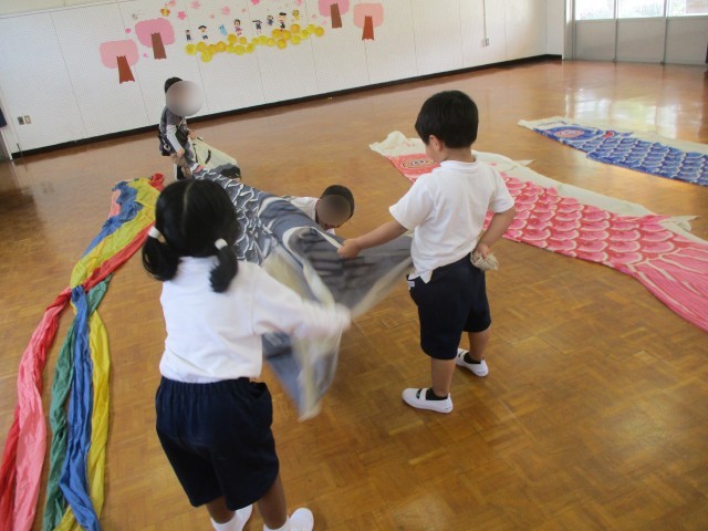 遊戯室では鯉のぼりの中に入ってトンネルのようにくぐって遊んでいます。