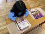 画用紙にいろいろな色のクレパスで色を塗り、その上から紙をひいて鉛筆で絵をかくと、...
