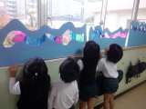 そら組の窓に貼ったステンドグラスが海の世界のように輝きます。とてもきれいで、子ど...