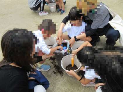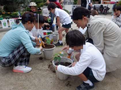 苗を植木鉢の中に入れ、優しくお布団(土)をかけていました。