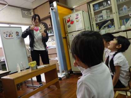5月保健指導 さくら・そら組 公開日 2024/05/17 更新日 2024/05/17 西中島日記 うがいの保健指導を実施しました。 口の中がみえるうがい君を使って、ブクブクうがいとガラガラうがいの違いについて話をしました。 歯みがき後はブクブクうがい、外から帰ってきたときはガラガラうがいだよ。ガラガラするとのどの奥にいるばい菌さんが流れていくよと話をしました。 指導の後、うがいの様子を見に行くと、ブクブク・ガラガラ上手にできていました。 いいね(0)