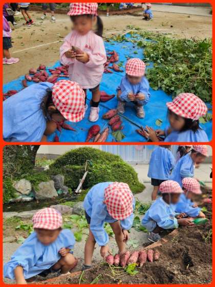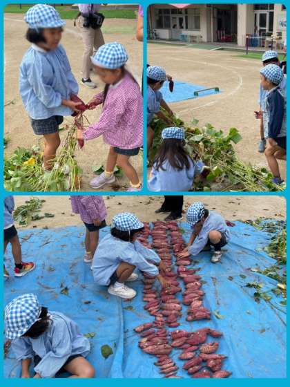 幼稚園の畑に5月に植えたお芋の苗が大きくなったので、お芋掘りをしました。つるをひっぱったり、土を掘ったりして、お芋が出てくると、「うわぁ〜、すごい」「やったぁ」と歓声があがっていました。掘れたお芋を数えてみると大小全部あわせて243個ありました。