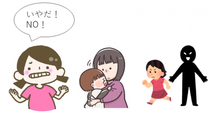 プライベートゾーンを見たり触ったりしていいのは自分だけで、友達のプライベートゾーンは見たり触ったりしないこと、もし嫌なことをされたら、1.「いやだ」、「やめて」と言う 2.大人の人に相談する 3.その場から逃げる の3つの約束をしました。