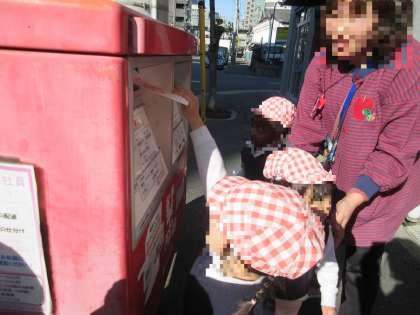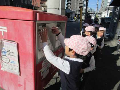 子どもたちが年賀状に絵をかき、みんなにポストに投函しました。