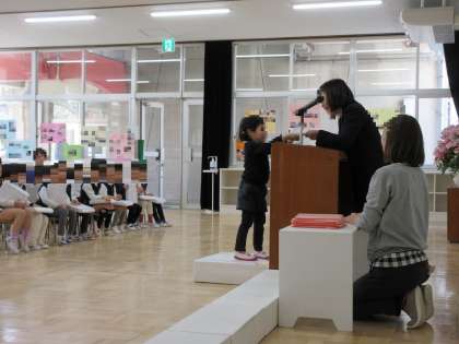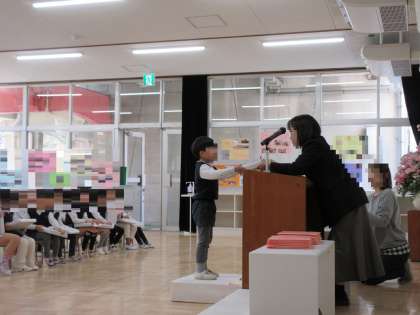 園長先生から進級記念品を受け取りました。