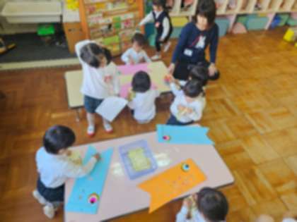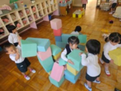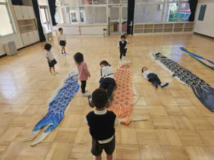 園庭の工事で外には出られませんでしたが、屋上で鯉のぼりをあげるのを見たり、遊戯室で鯉のぼりの大きさ比べをしたり、シールをペタペタ貼って自分の鯉のぼりをつくったりしました。ウレタン積み木を積んで家もつくりました。休みの間にうまれていたちょうちょう3匹が飛んでいくのを見送りました。