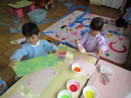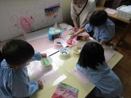 染め紙に挑戦 公開日 2025/04/23 更新日 2025/04/23 西中島日記 さくら組(4歳児)が今日は染め紙に挑戦しました。 紙を折ったり、絵の具につけたりと、みんな真剣なまなざしでした。 絵の具を吸わせると「赤が広がっているよ!」と紙が染まっていることを発見したり、完成した染め紙を「タオルみたい!」と友達と見せ合ったりして楽しんでいました。 いいね(0)