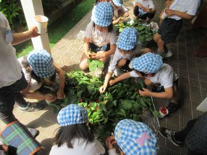 収穫したサクランボをみんなに分けよう!ということになり、カップにサクランボを入れていきました。「赤いのだけじゃなくて、この黄色っぽいのもどんな味か食べてみたいな」「2つとか、3つひっついてるのがいいな」等と言いながら分けていました。