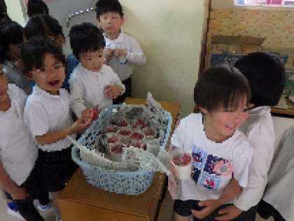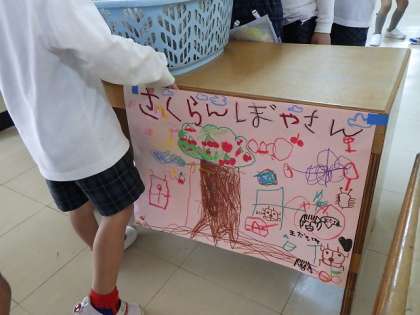 その後、そら組(5歳児)がサクランボ屋さんを開いてくれました!さくら組(4歳児)はとっても嬉しそうにサクランボをもらっていました。