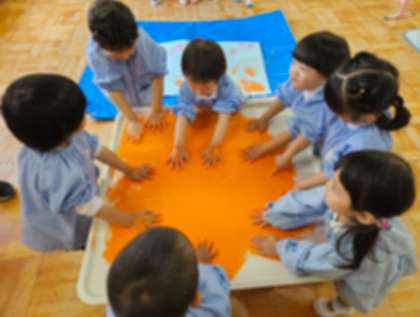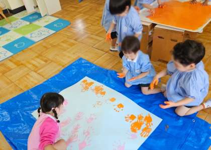 指絵の具でたくさんの色を混ぜたり、手形をしたりして遊びました。